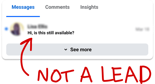 Yesterday, I bragged that my last FB Marketplace ad brought in 25 leads. I got this email in reply: When you say 25 leads, are they viable leads with contact info or just people commenting "is this still available"? - Matt (Florida)