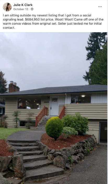 Result: She signed a $684,950.00 listing shortly after My goal right now is to ignite listing flow for a handful of agents in the next 30 days. Just like Julia did within two weeks of us working together, thanks to my simple, yet powerful listing-getting methods. Want me to do the same for you? Here is how it works: