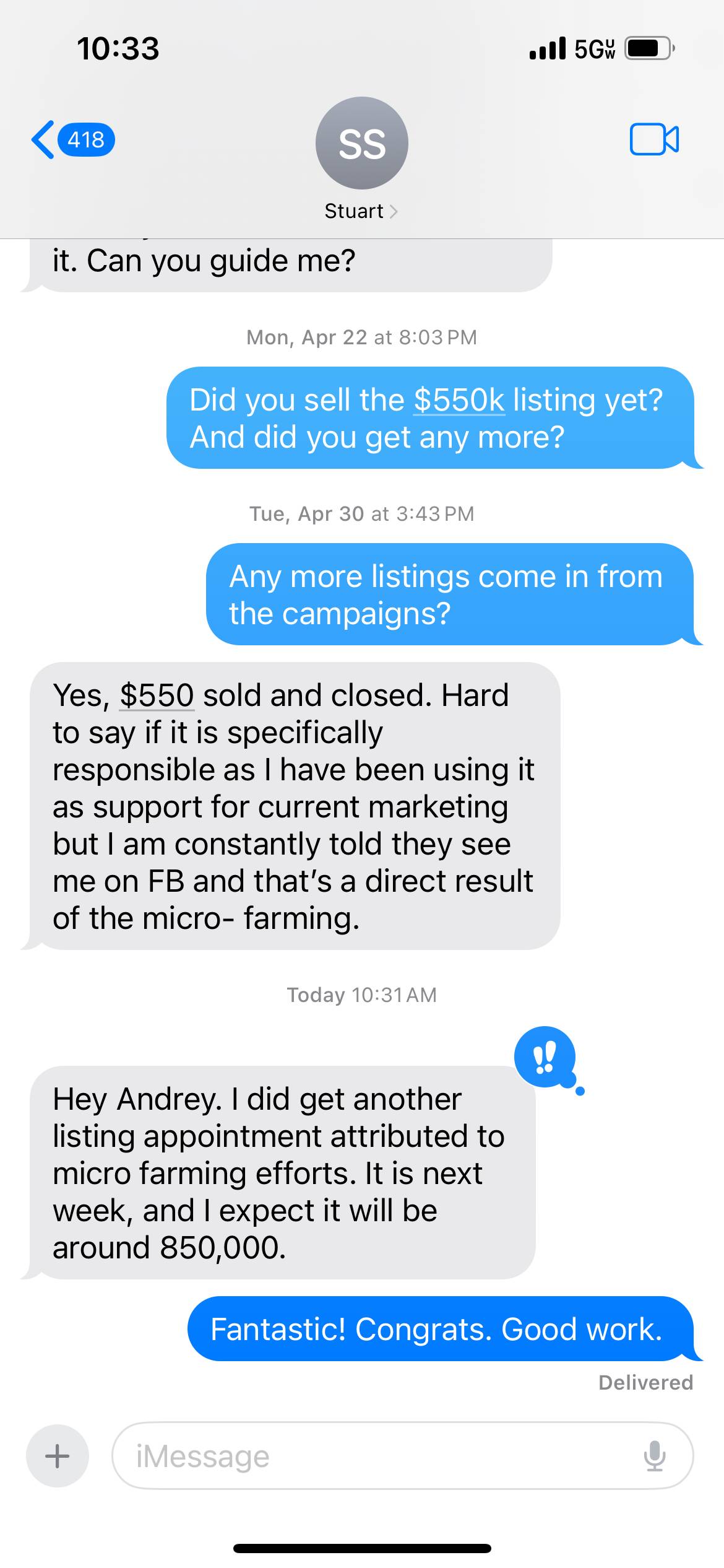 | Got this text from my client Stuart last week: He's running my Micro-Farming Method. (My favorite listing-getting method I've developed and fine-tuned over the past 15 years) His first listing was for $550,000. Now a second one for $850,000. This is how it starts (and grows). The longer you run the Micro-Farming Method, the more results it produces. Sorta like a "snowball effect". This is how another client, Michael, generated $72,000 in commissions in 9 months, from just *ONE* Micro-Farming Method campaign: Want me to build and deploy this for you as well so you can be one of my next success stories? Hit REPLY and let me know you'd like to talk. We'll get on the phone, go over the details, and if we both think it's a mutually good fit we'll get you enrolled and start working. Here's the basics of enrollment: