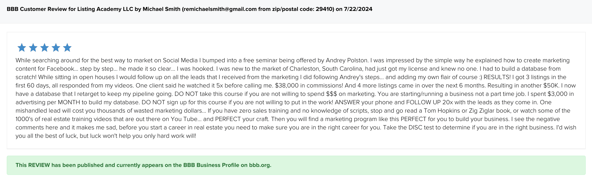 | Michael Smith, in Charleston, SC just shared this public review of his results. BTW, I've been saying he generated $72k in commissions ... but he corrected me and informed me he's actually generated $88,000.00 in commissions from just one of my Core 4 Methods. Co-incidentally, Michael has just officially re-enrolled in one my listing programs to run it up again :-) Here is what Michael just posted: Excerpt from his above share: "I got 3 listings in the first 60 days, all responded from my videos... $38k in commissions... and 4 more listings came in over the next 6 months... resulting in another $50k" I love how Michael also shares who my listing programs are for and who they are NOT for: