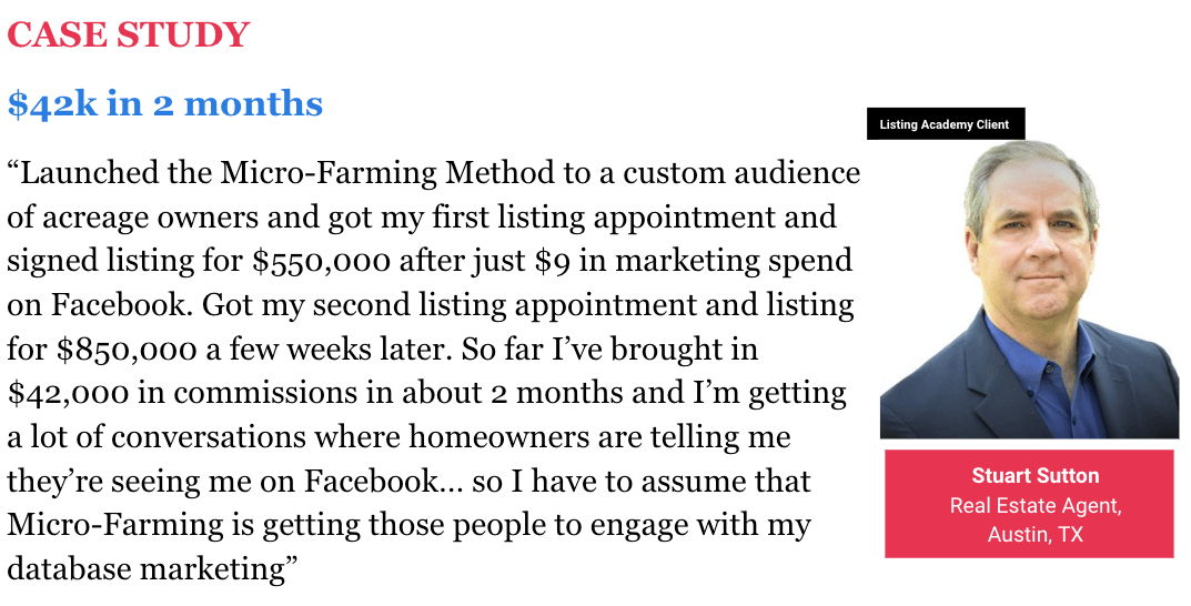 Result: He cashed $42,000.00+ in commission checks within 60 days... Unlike what most "coaches" and "marketers" will tell you, you actually don't have to spend $10,000 a month on marketing to get steady new listings. There's a radically different way that costs way less money and takes way less time to get results. And if you do it this way, you can get just as good results as the "big names" selling $10,000 a month services. My goal right now is to jump-start listing & commission flow for 10 agents in the next 30 days. Just like Stuart did thanks to my simple, yet powerful strategy I helped him execute. Want me to do the same for you? Here is how it works: